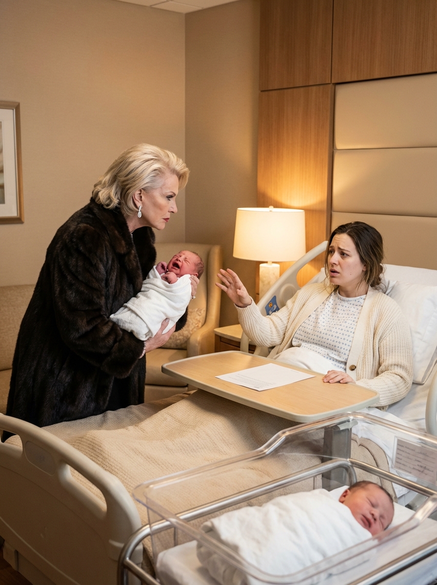 Acababa de sobrevivir a una cesárea de emergencia cuando mi suegra entró en mi habitación de recuperación, dejó unos papeles de adopción sobre mi cama y, con toda tranquilidad, me dijo que se llevaba a mi hijo recién nacido para su hija. Luego me llamó inestable e intentó poner a seguridad en mi contra. Lo que ella no sabía era que llevaba años ocultando mi verdadera identidad, y en el momento en que el jefe reconoció mi nombre, todo cambió.