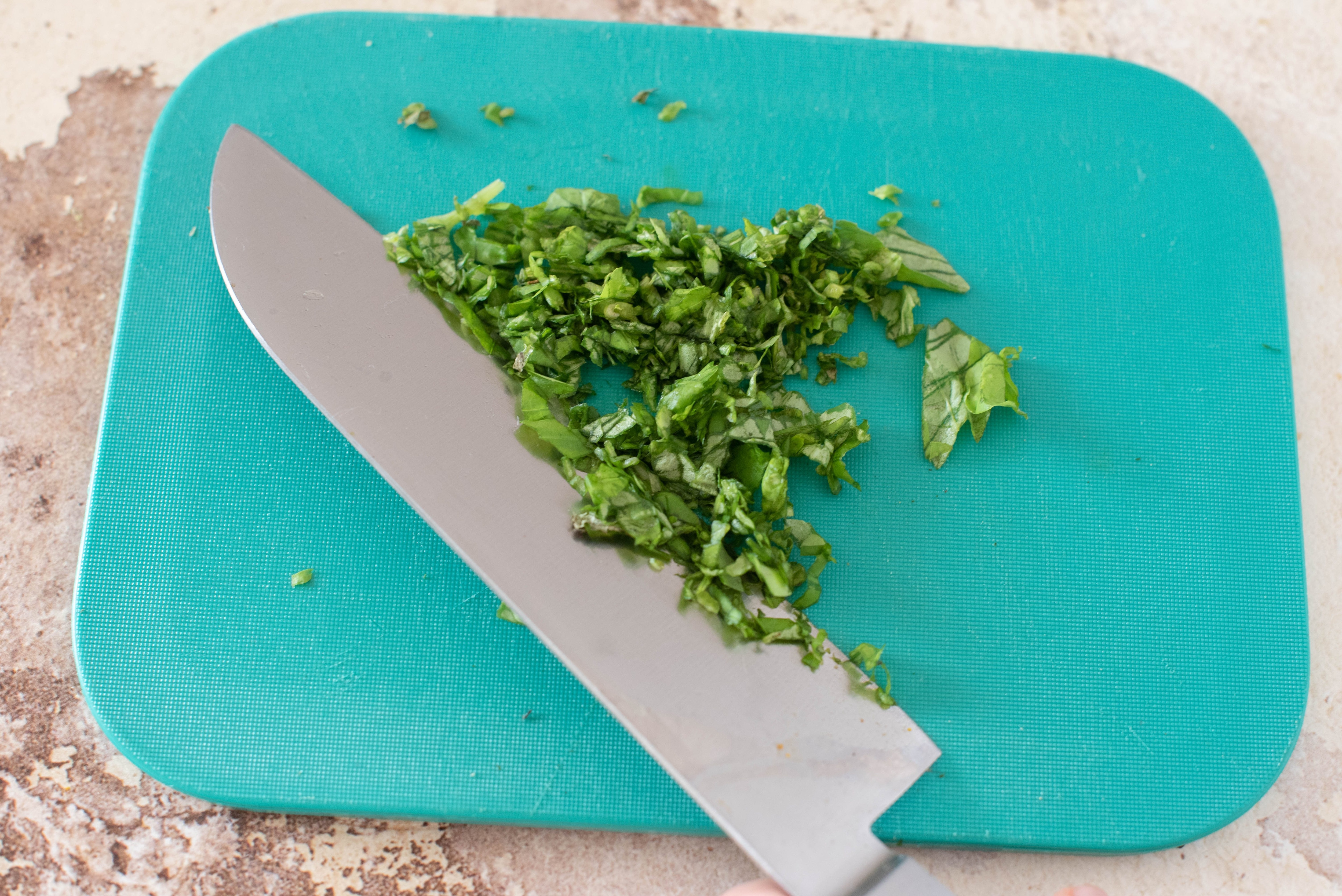 Escurrir las hojas sobre una tabla de cortar.13y quitar la nervadura central.