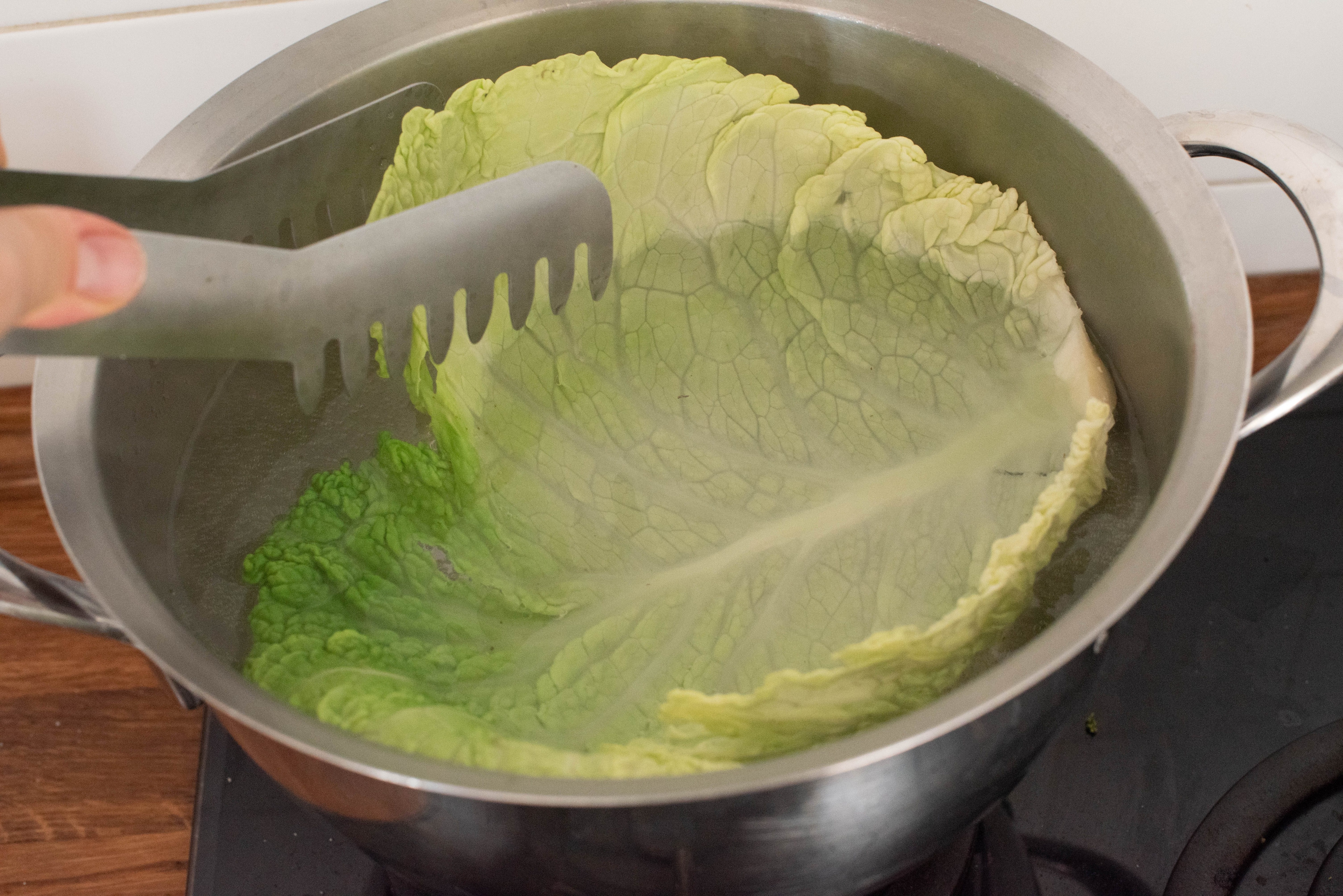 Limpiar la col y cortar 8 hojas grandes enteras.11. Lávalos con cuidado.