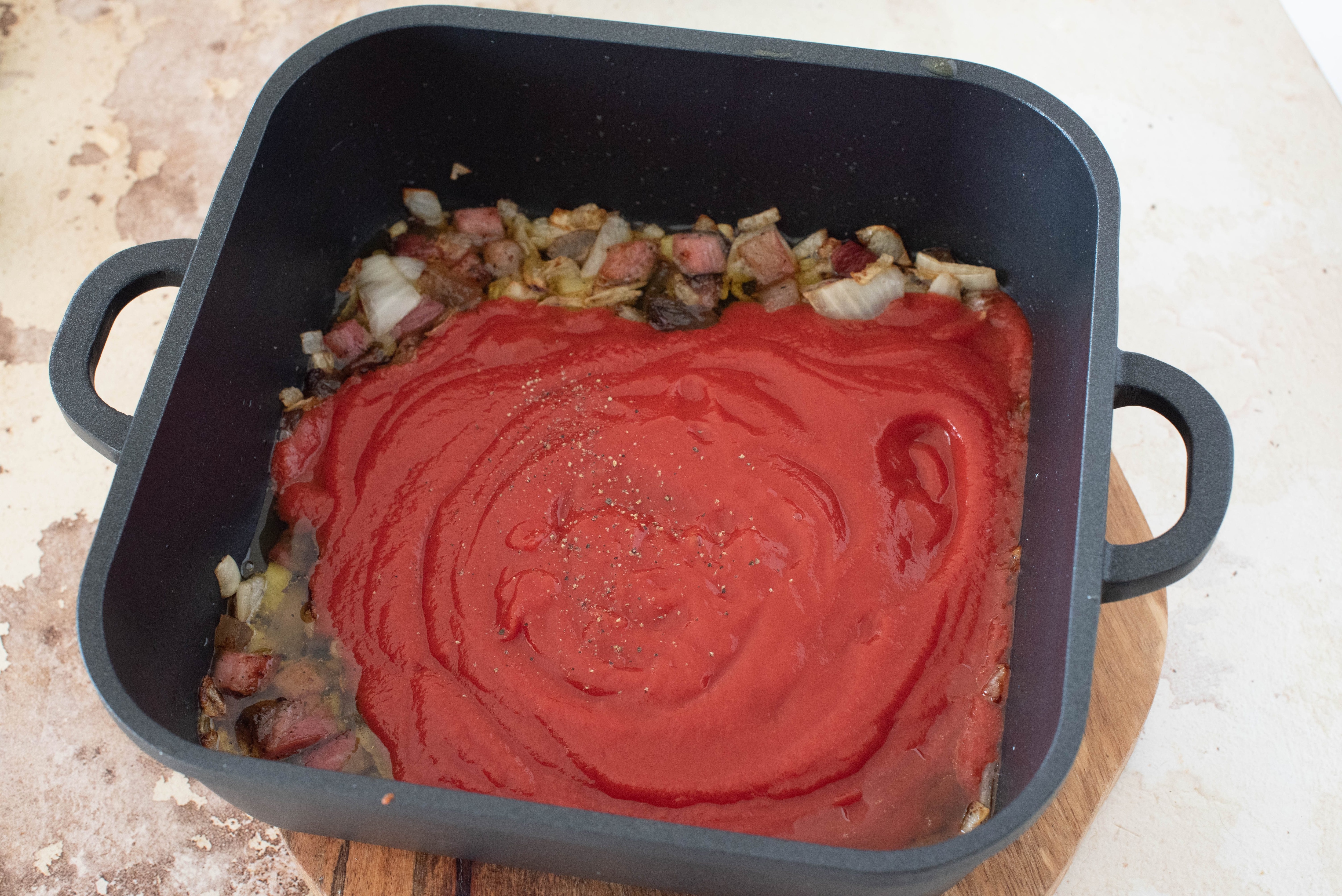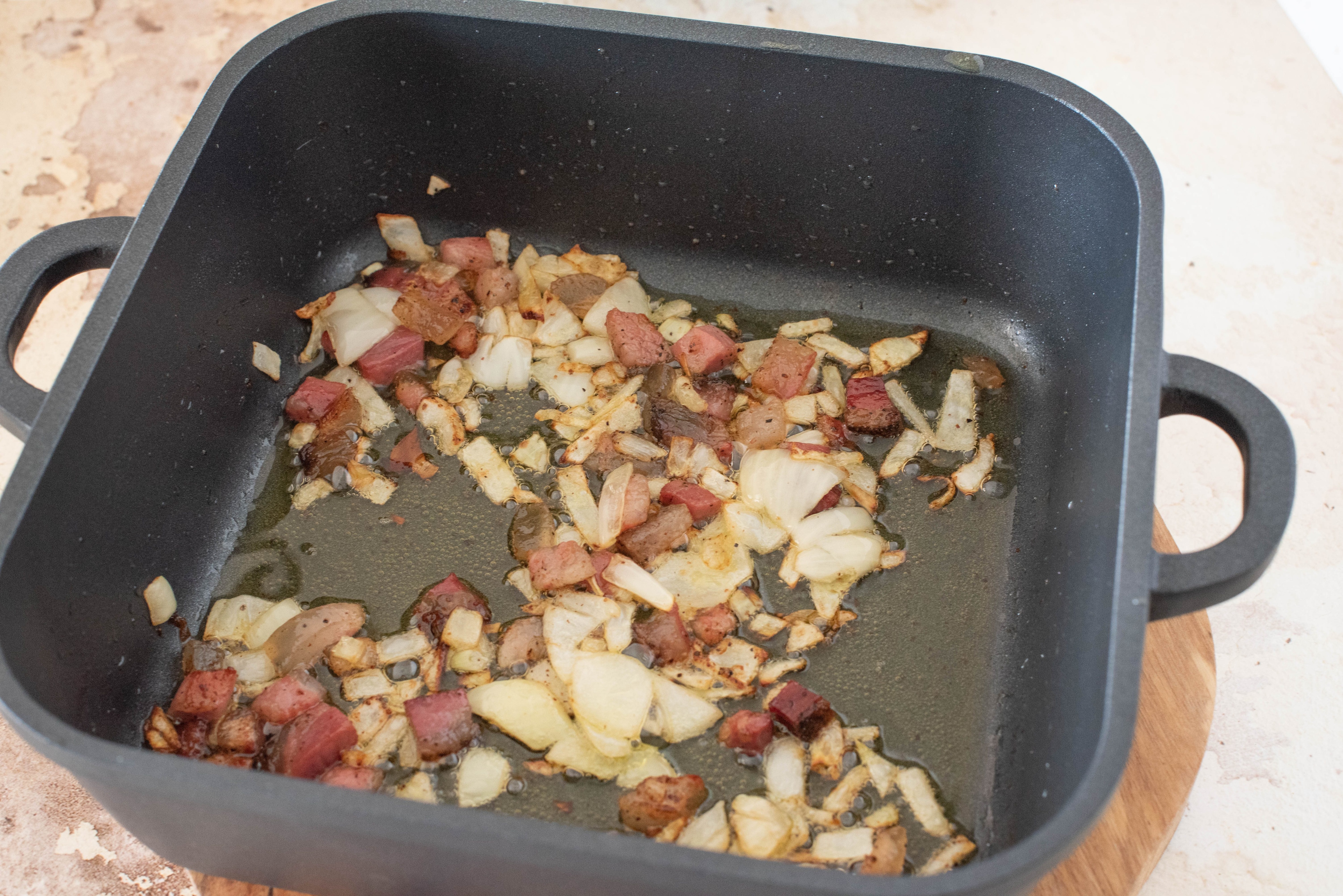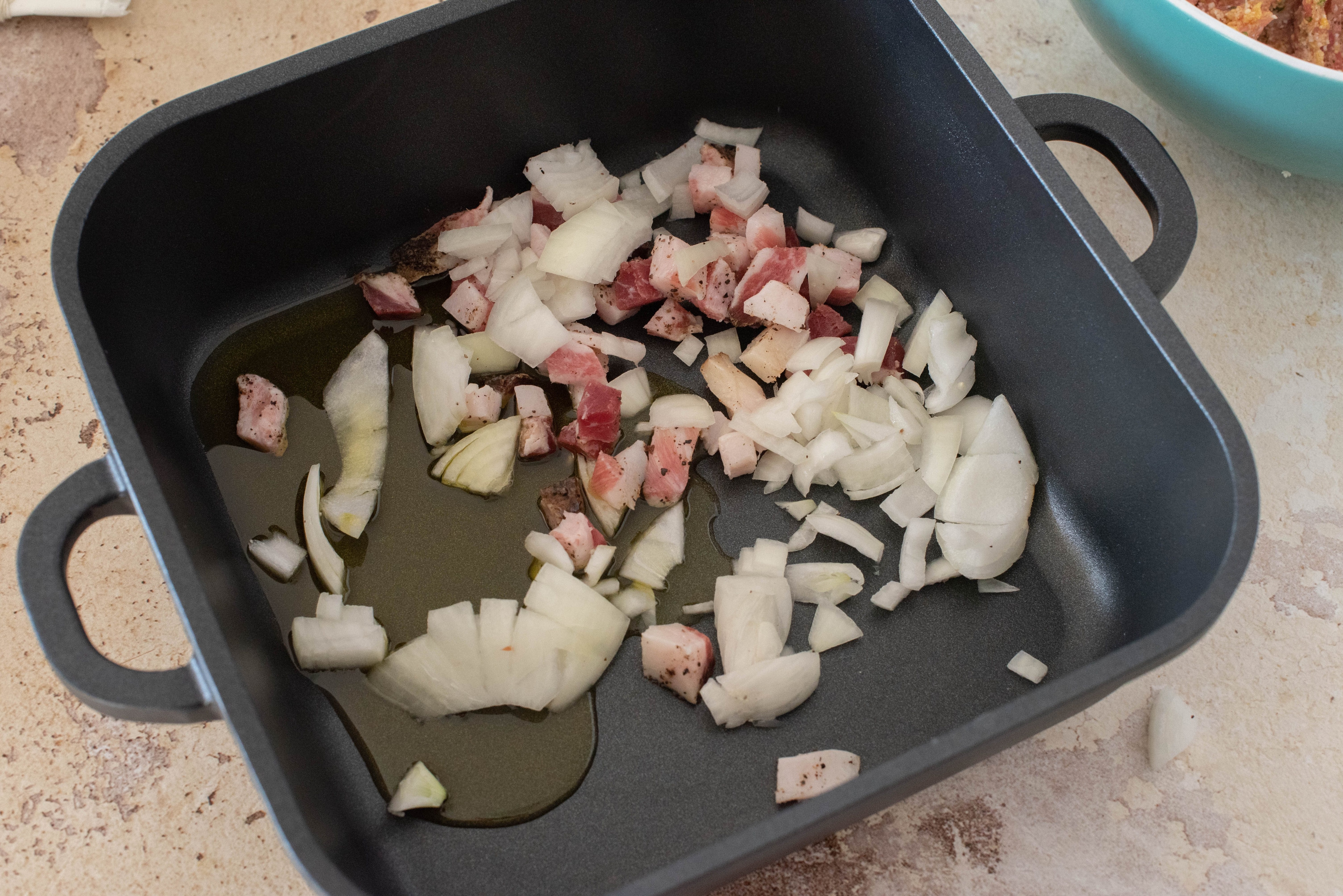 Pasar el tocino y la cebolla a una cacerola y añadir un chorrito de aceite.21.