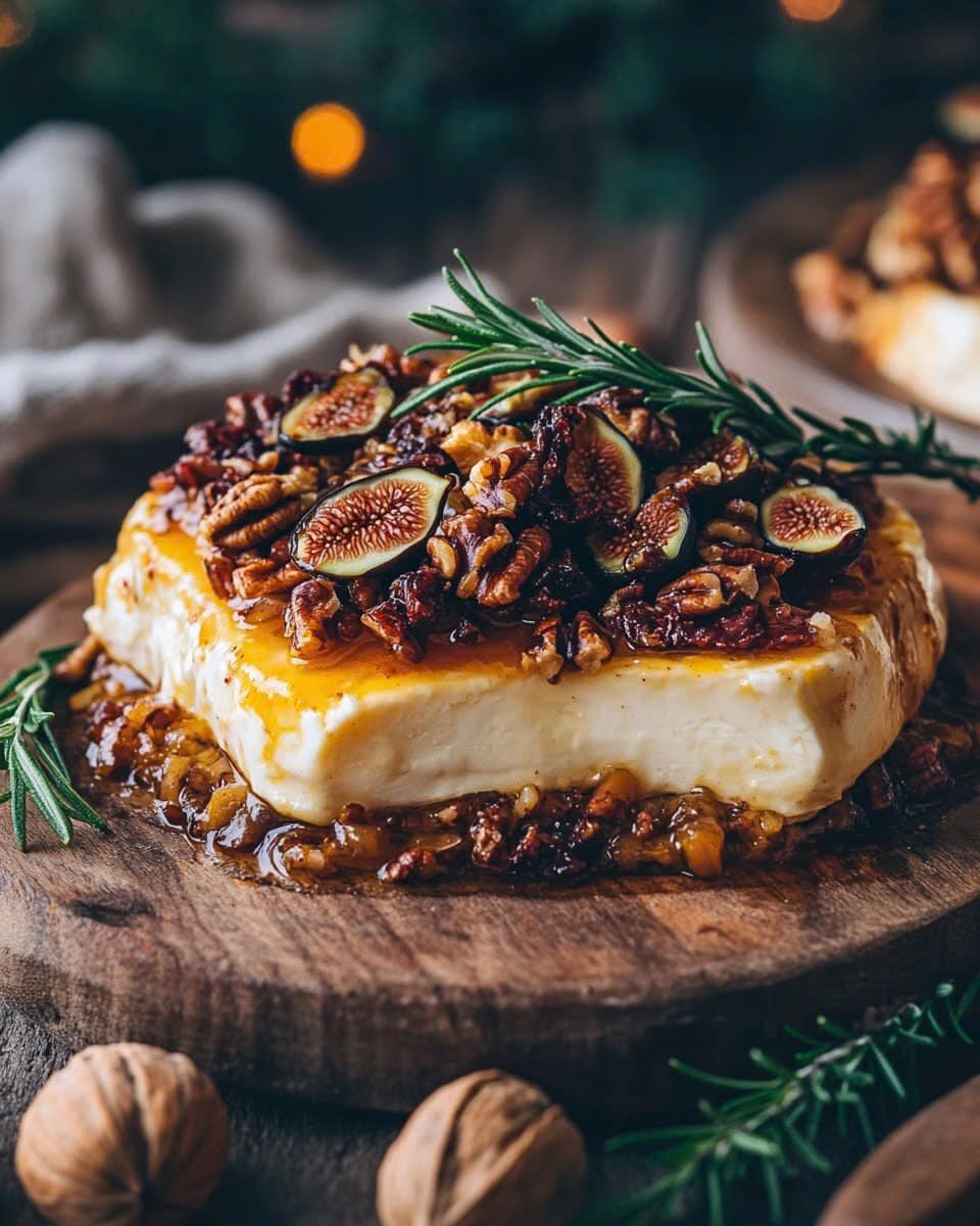 Ingredientes: 1 rueda de brie 1/4 taza de puré de calabaza 2 cucharadas de pasta de higos o mermelada de higos 1/4 cucharadita de canela 1/8 cucharadita de nuez moscada 1/3 taza de nueces tostadas picadas Ramitas de romero fresco para decorar (opcional)