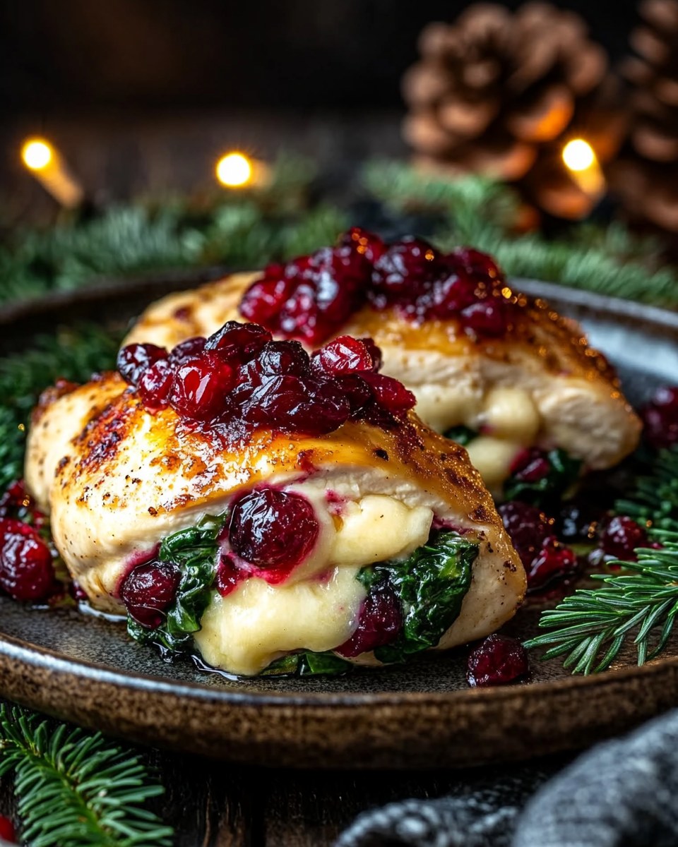 Ingredientes: 4 pechugas de pollo deshuesadas y sin piel Sal y pimienta al gusto 4 oz de queso brie, en rodajas 1 taza de espinacas frescas, salteadas 1/2 taza de arándanos rojos secos 1 cucharada de aceite de oliva Romero fresco, para decorar Opcional: arándanos rojos frescos para decorar