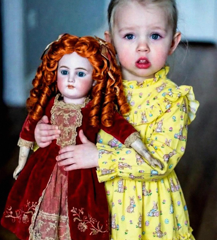 Tenía unos ojos azules brillantes, grandes y abiertos. Y sostenía una muñeca más pequeña en sus brazos de tela.