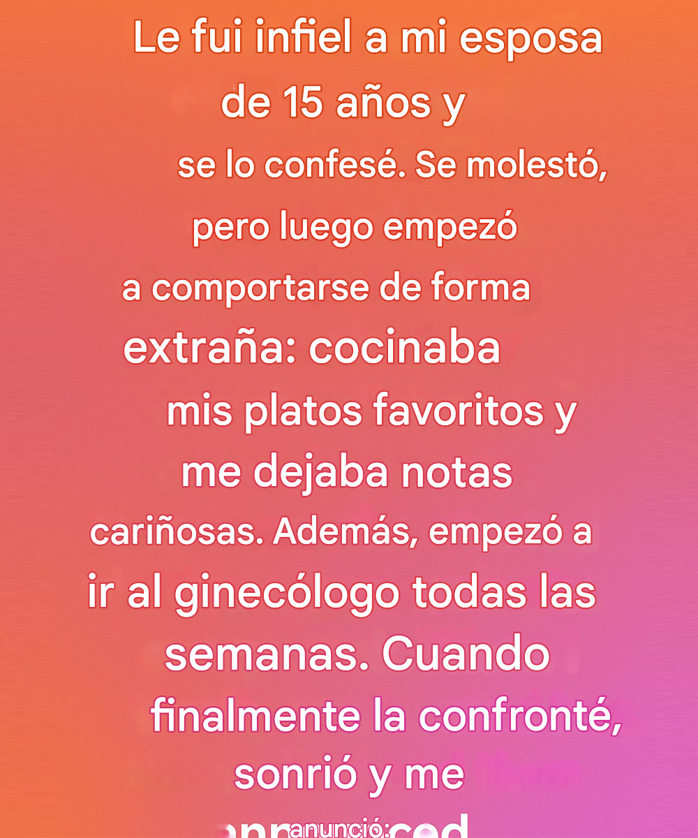 Pasaron las semanas, y su calma me inquietaba. Cada semana decía que tenía citas con su ginecólogo. Intenté confiar en ella, pero la culpa me hacía sospechar.