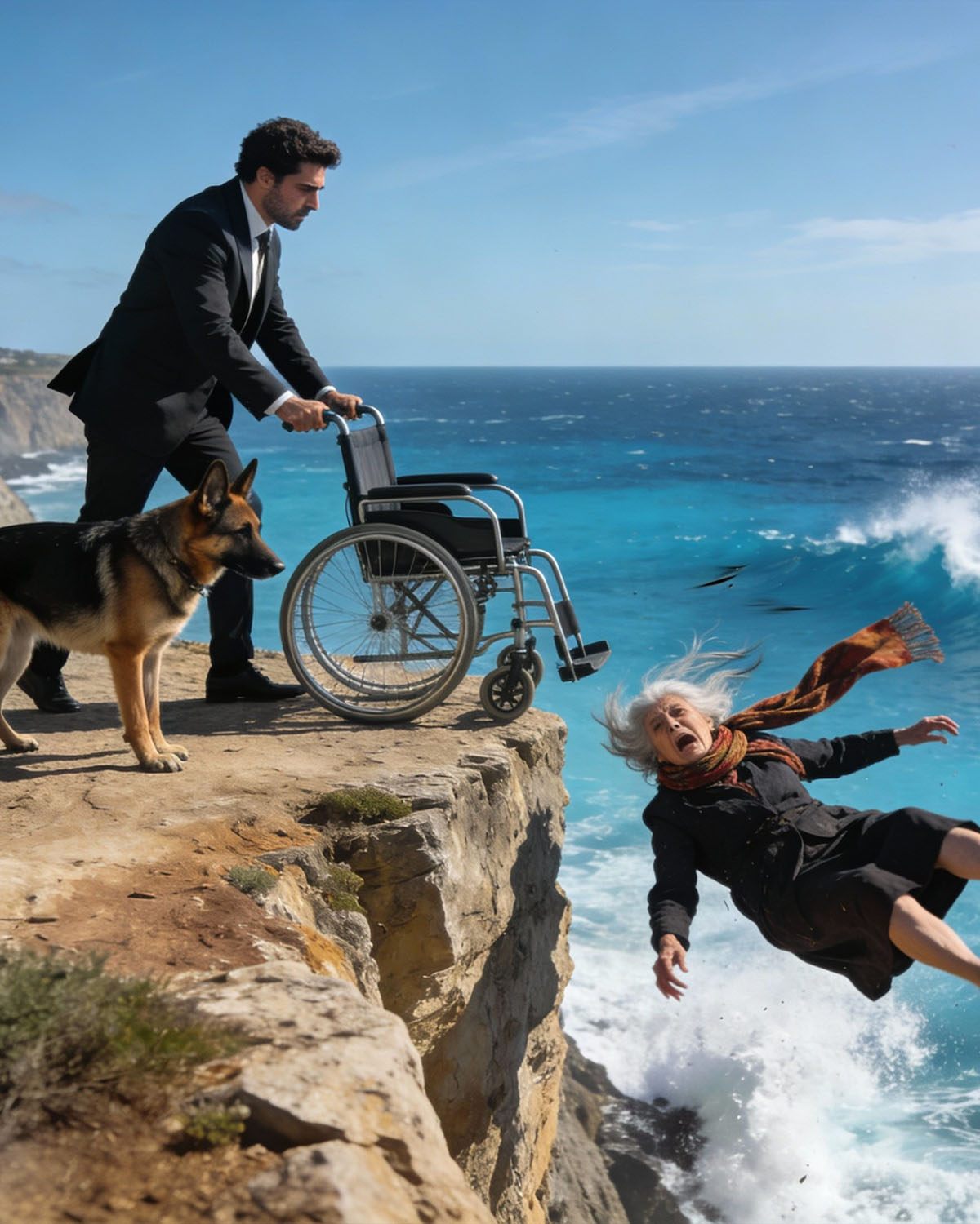 Alberto abrió la puerta con brusquedad. Tomó la silla de ruedas plegable, la colocó cerca del borde del mirador y empujó suavemente a su madre hacia ella. Tras unos segundos de silencio, respiró hondo y, con un gesto frío, empujó a Doña Elena hacia el vacío.