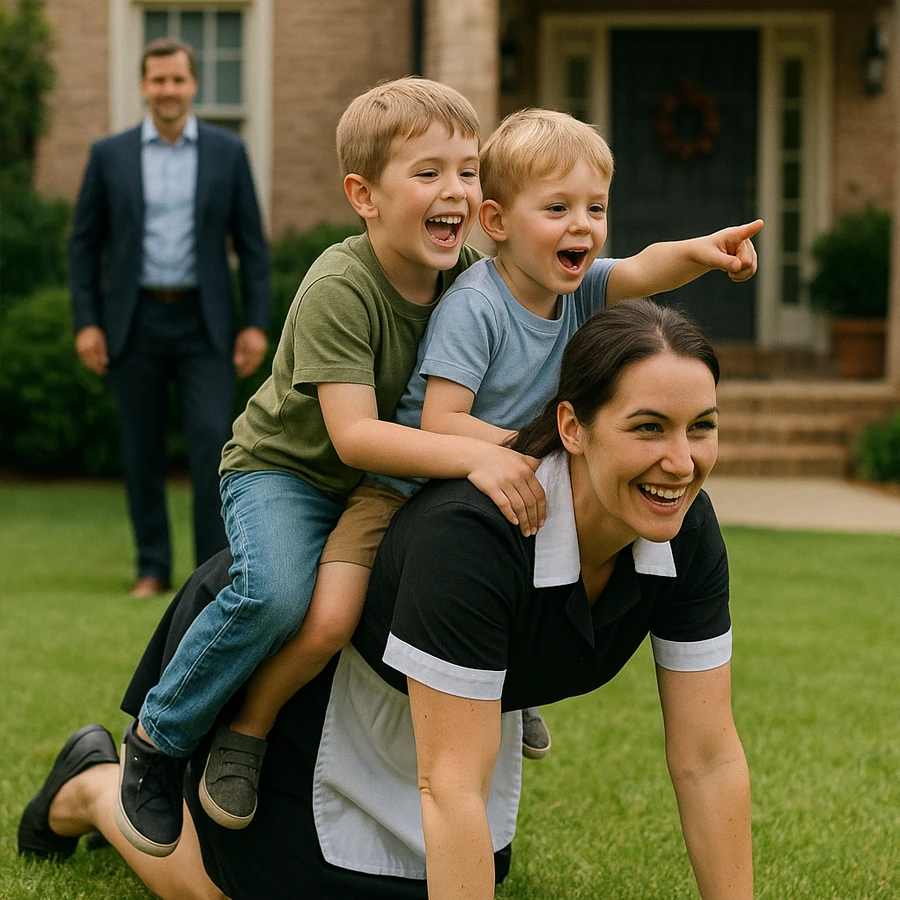 Una tarde soleada, Alejandro regresaba antes de lo habitual de una reunión. Al entrar en el jardín, escuchó carcajadas que lo dejaron desconcertado. Decidió acercarse en silencio y lo que vio lo paralizó: Mariana, con uniforme sencillo, estaba en cuatro patas en el césped, mientras sus dos hijos montaban en su espalda como si fuera un caballo.