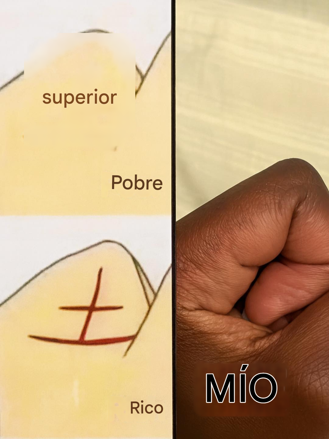La mitad superior de la imagen muestra una palma cerrada con una línea cruzada cerca del pulgar, etiquetada como "Pobre". Esto sugiere que, según la creencia mostrada, ciertas marcas en la mano se correlacionan con la falta de riqueza