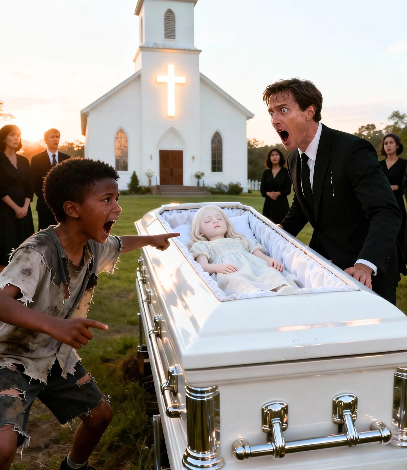 El funeral había sido silencioso —un multimillonario llorando la pérdida de su única hija—, pero el silencio se rompió cuando un chico negro delgado con la ropa rota corrió por el pasillo, gritando con voz temblorosa: "¡No la entierren! ¡Su hija aún vive!".