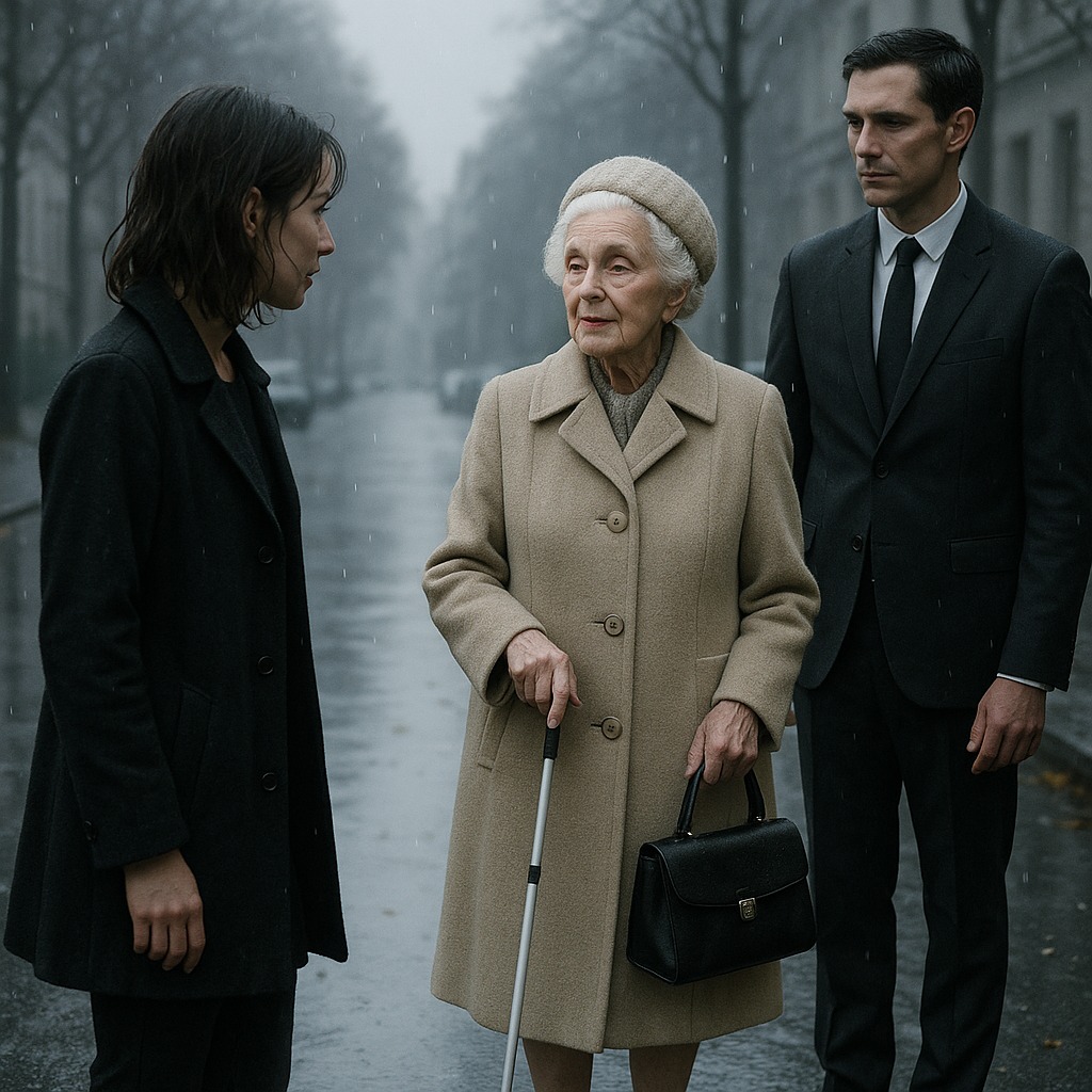 De pronto escuché una voz dulce, serena, casi cantada. “Está bien, hija.”, giré la cabeza. Una anciana ciega se apoyaba en su bastón con un abrigo beige y un sombrero de lana que parecía sacado de otra época. Tenía el cabello blanco, perfectamente recogido, y los labios pintados de un rojo suave que contrastaba con su piel pálida. sostenía una bolsa pequeña y junto a ella había un hombre alto de traje oscuro que parecía su chóer. Estoy balbuceé sin poder sostenerle la mirada.