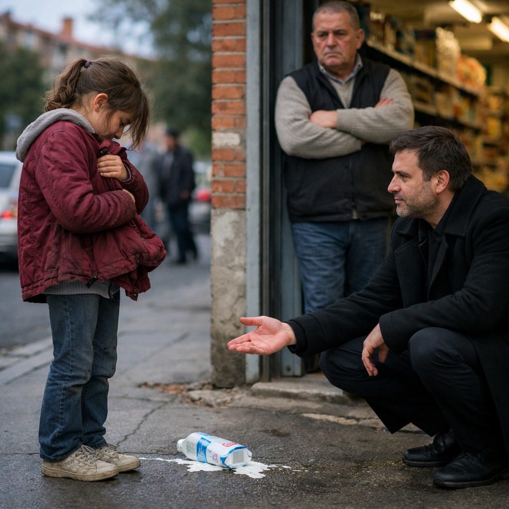 La voz enfadada del encargado de la tienda resonó en el aire frío de finales de octubre mientras Lucía Herrera, una niña delgada de diez años, salía tambaleándose del pequeño supermercado de barrio en las afueras de Madrid. Tenía la cara roja de tanto llorar y las manos pequeñas apretando una chaqueta vieja. Hace apenas unos segundos había sostenido una simple caja de leche… hasta que se la arrancaron de los dedos.