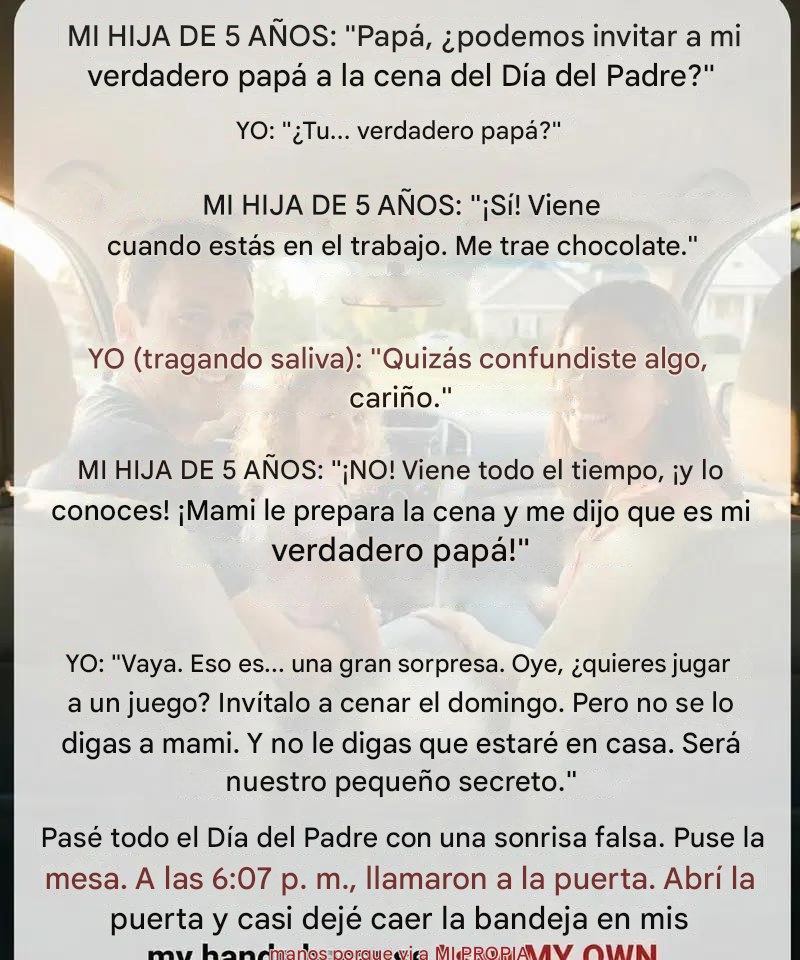 No dejé que el pánico se manifestara. No dejé que la ira me dominara. Lo convertí en un "juego de cena sorpresa" para el Día del Padre, dándole una forma de hablar libremente y dándome a mí una forma tranquila de recopilar pistas. Le encantó la idea, emocionada de convertir sus pensamientos en una misión. Mientras tanto, una fría pesadez se formó en mi pecho: el instinto de que algo estaba sucediendo justo debajo de mis narices.