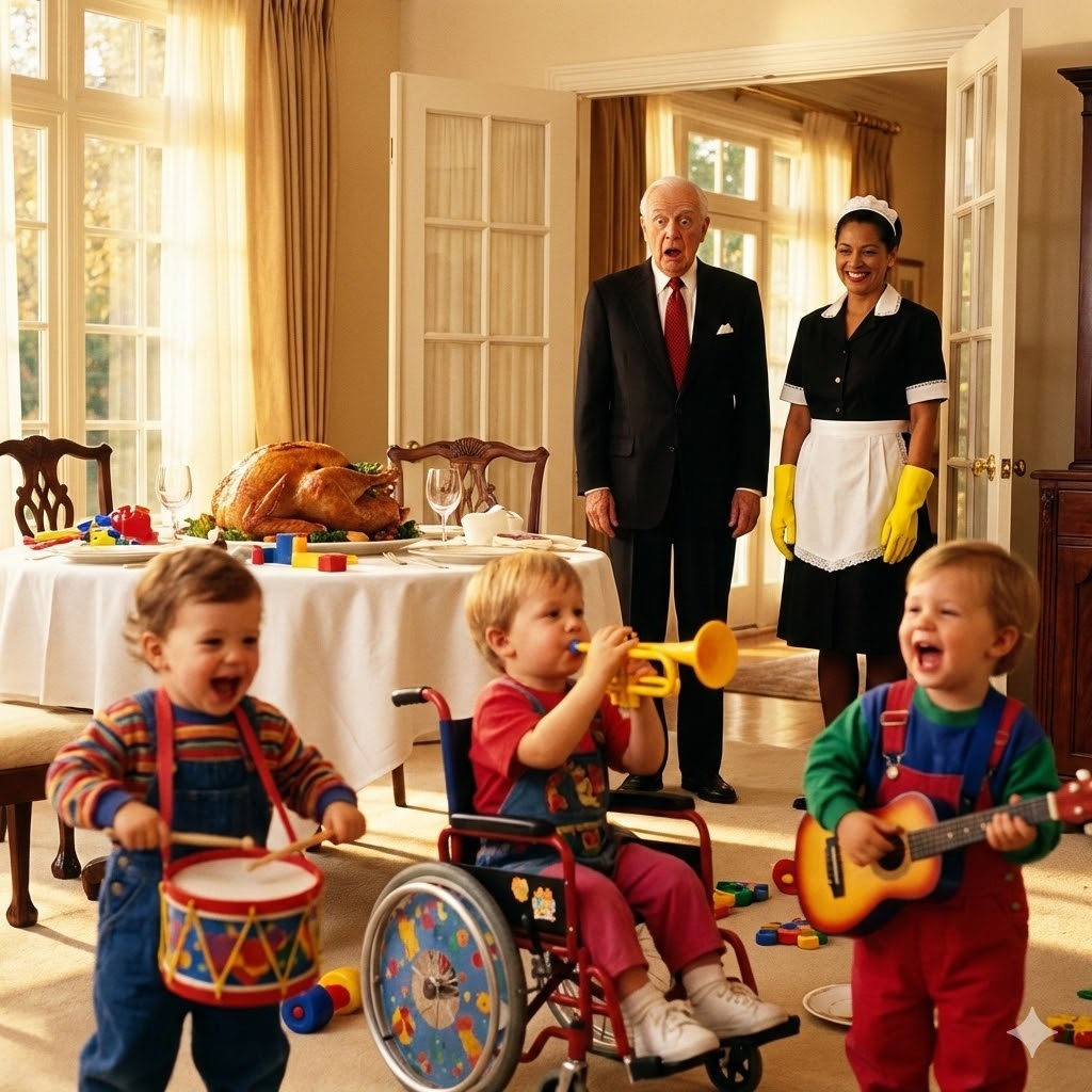 Esteban frunció el ceño, sintiendo una mezcla de confusión y enojo. Abrió la puerta del comedor de golpe, listo para imponer el orden. Pero la escena que encontró le robó el aliento. La mesa del comedor, usualmente impoluta, era un desastre de migajas y servilletas. Tomás golpeaba una cacerola con una cuchara de madera, Lucas soplaba una flauta de juguete, y en el centro de todo aquel caos estaba Mateo.