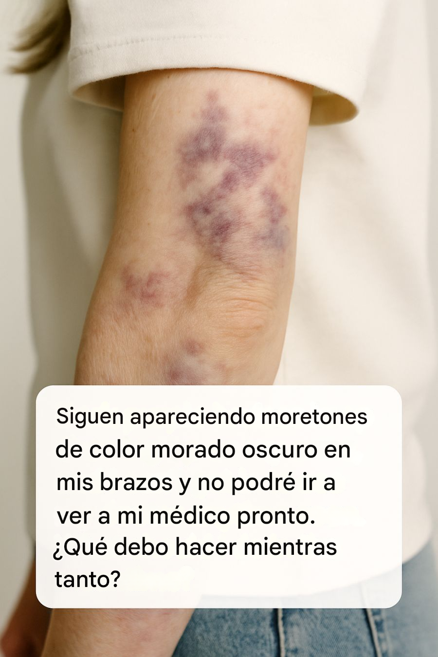 Los moretones de color púrpura oscuro que aparecen en los brazos pueden ser preocupantes, especialmente si parecen aparecer sin una causa obvia. Mientras espera su cita con el médico, es importante comprender las posibles razones de estos moretones y cómo puede controlarlos mientras tanto. Sin acceso inmediato a consejo médico, conocer los conceptos básicos sobre los moretones y el autocuidado puede brindarle cierta tranquilidad y ayudarle a controlar sus síntomas de manera efectiva