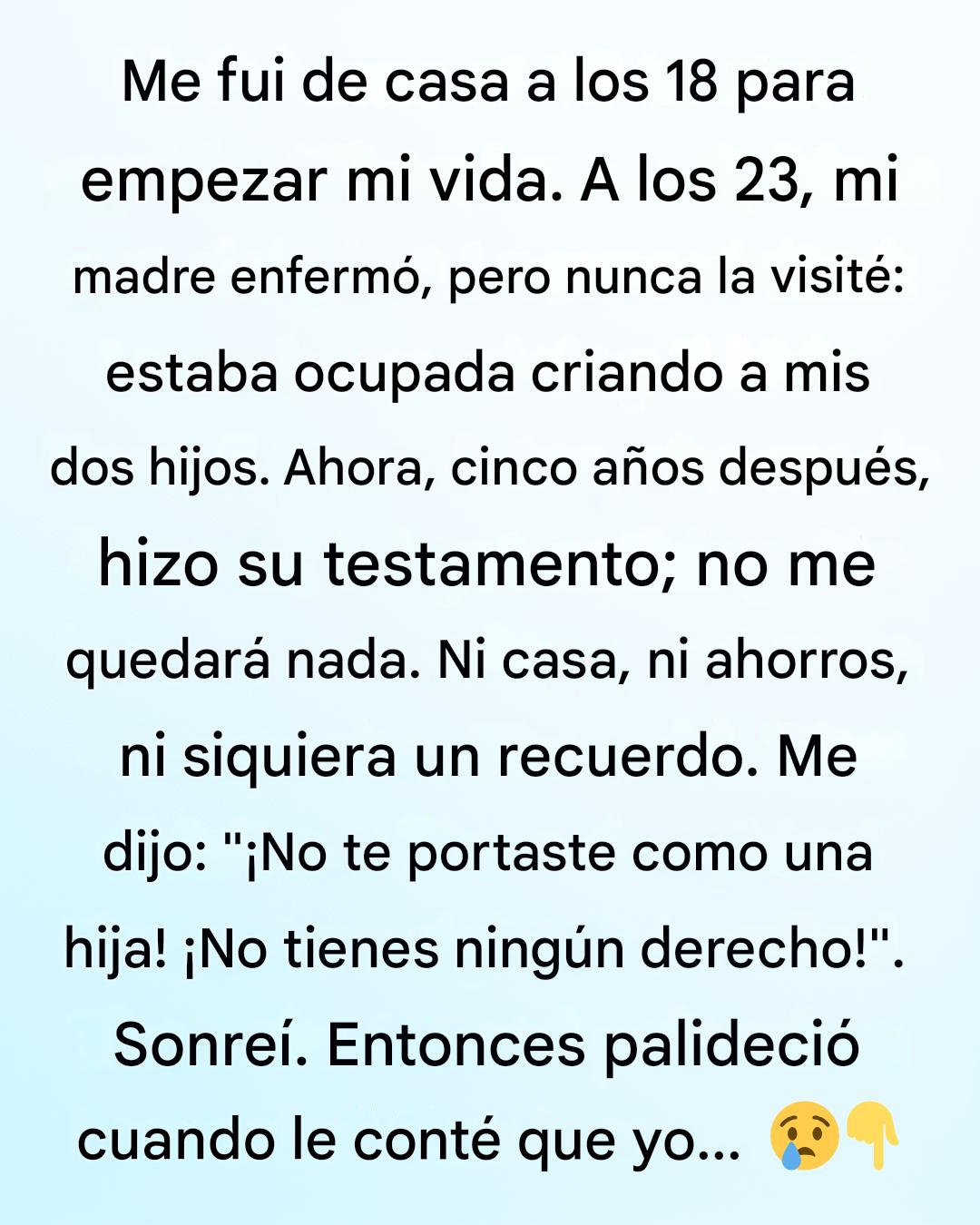Mamá dijo: “¡No te portaste como una hija! Nunca me consideraste de la familia. ¡Así que no tienes derechos!”. Sonreí.