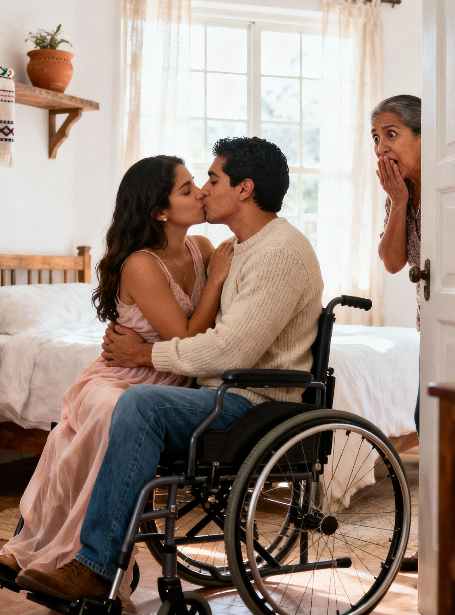 Tenía los brazos alrededor de una chica también en silla de ruedas, pegados boca con boca, besándose como si el mundo fuera a acabarse.