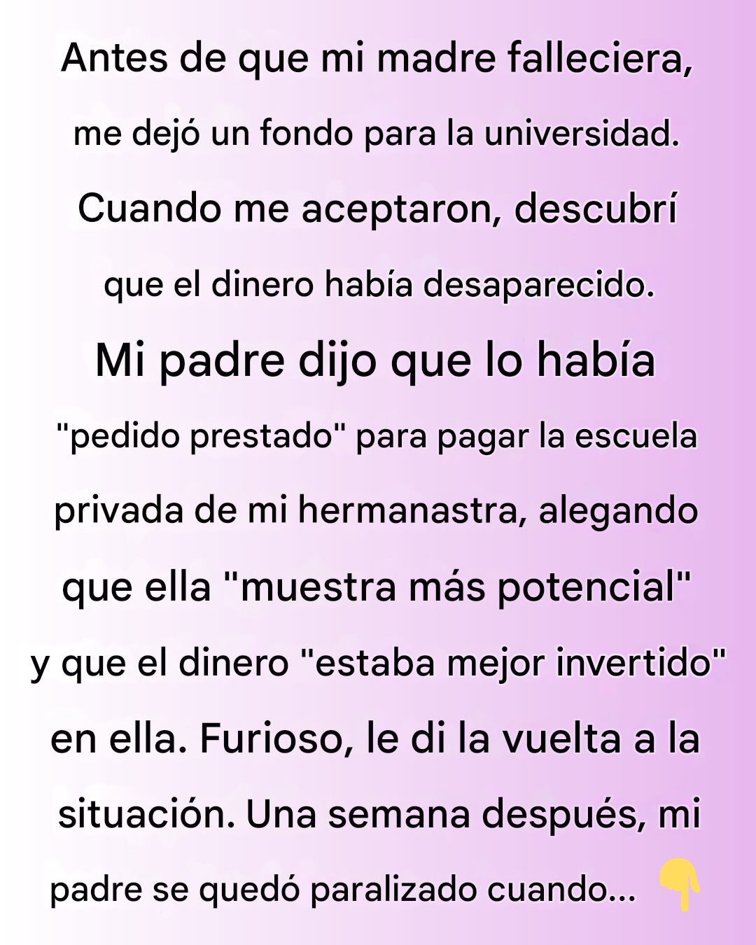 Pero lo aguanté, sobre todo porque mi madre me había organizado un fondo para la universidad, y mi padre se encargaba de guardarlo hasta que pudiera usarlo después de la preparatoria. Trabajé duro, me admitieron en la universidad de mis sueños y estaba lista para empezar esta nueva etapa.