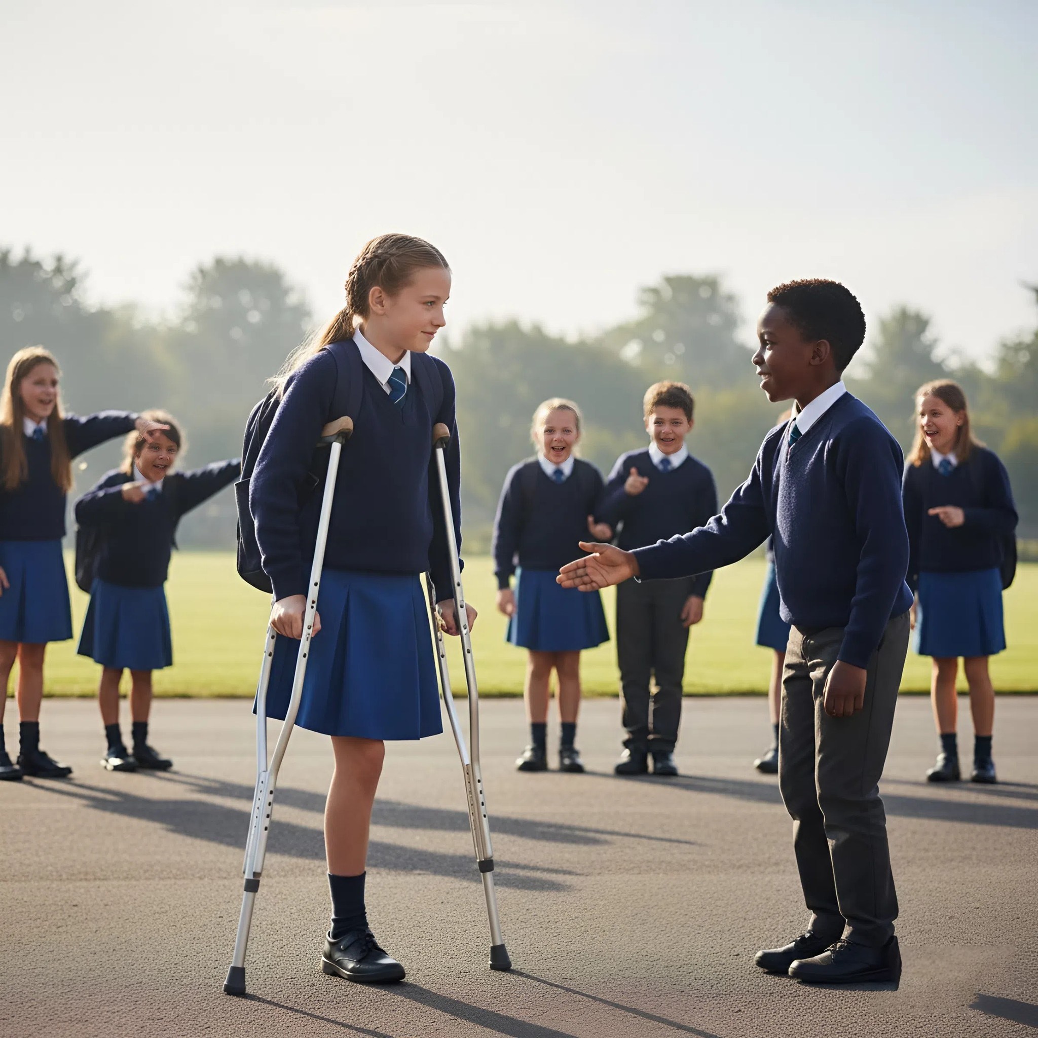 Los ojos azules de Emily brillaban con una frágil esperanza; su sonrisa, temblorosa pero sincera; sus muletas ya no eran símbolo de debilidad, sino testimonio de resiliencia. La presencia de Noah era un escudo, una declaración de que la bondad podía surgir de los lugares más inesperados. Juntos, reescribieron las reglas del juego, transformando el desprecio en solidaridad.