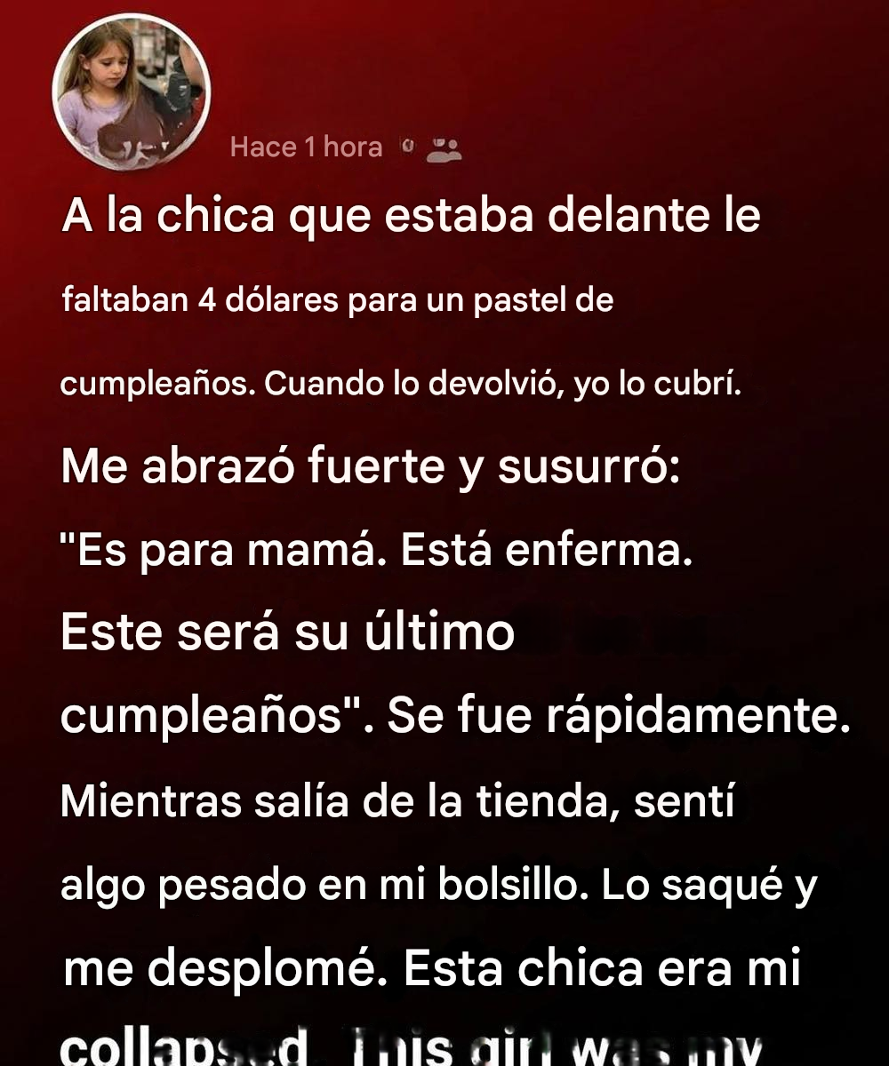 Estaba haciendo fila, absorto en mis pensamientos, cuando una niña me llamó la atención. No tendría más de diez años y sostenía con cuidado un pequeño pastel de cumpleaños en ambas manos, como si significara todo para ella.