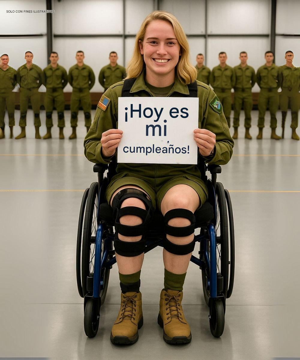 En la imagen, se ve a una joven vestida con uniforme militar sentada en una silla de ruedas, sosteniendo un cartel con un mensaje simple pero significativo: “¡Hoy es mi cumpleaños!”. Detrás de ella, sus compañeros soldados se mantienen orgullosos en formación, mostrándose solidarios.